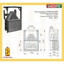 Угловой камин из Гарского камня. Плита и консоль из огнеупорного кирпича, толщиной 1,5 см. Деревянная балка Iroko. Металлическая топка 904 с колосником и зольником.