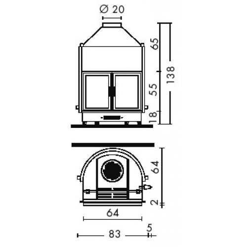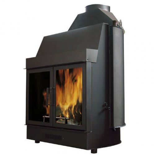 Каминная топка для открытой системы. Корпус из утолщенной стали, чугунный очаг, витрокерамическое стекло, резистентное к температуре до 800°, бак для воды на 70 литров. Открытие вбок.